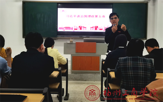 11月11日上午,福州工商学院文法学院教工党支部以“深学细悟党的创新理论,凝心聚力赋能教育事业”为主题,在崇德楼110教室召开了《习近平谈治国理政》第五卷专题学习会。支部全体教工党员参会,党支部书记王灿阳担任主讲人,系统解读著作核心要义与实践要求。