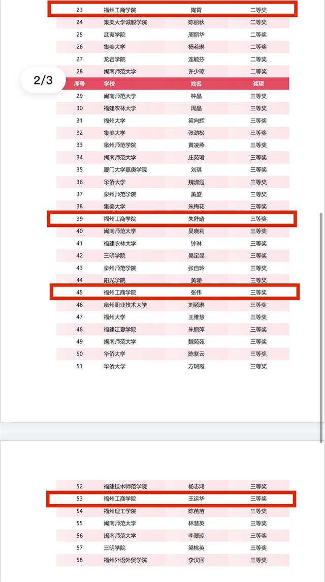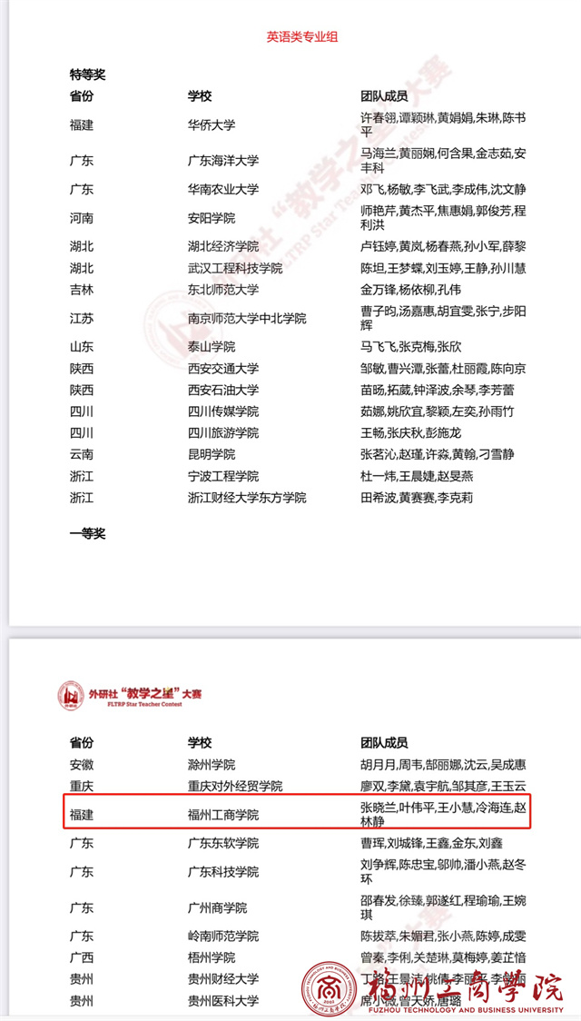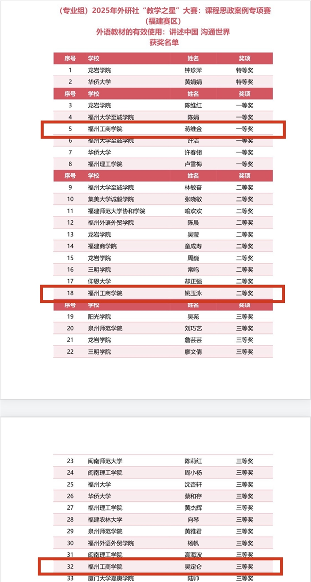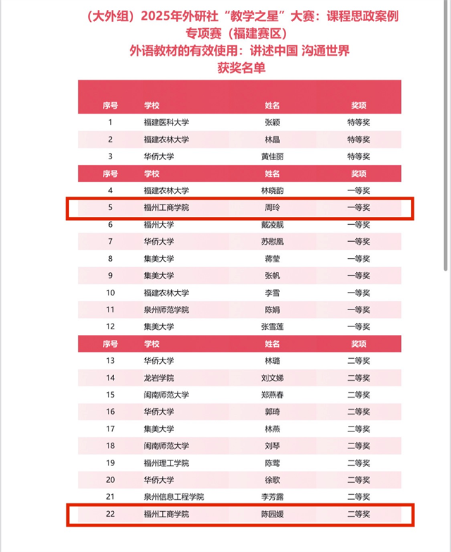 在2025年外研社“教学之星”大赛:课程思政案例专项赛福建省决赛中,我校文法学院英语教师再创佳绩,荣获多项省级大奖:蒋维金荣获英语专业组一等奖、周玲荣获大学英语组一等奖、姚玉泳荣获英语专业组二等奖、陈园媛、陶霄荣获大学英语组二等奖、吴定仑荣获英语专业组三等奖、朱舒晴、张伟、王运华荣获大学英语组三等奖。