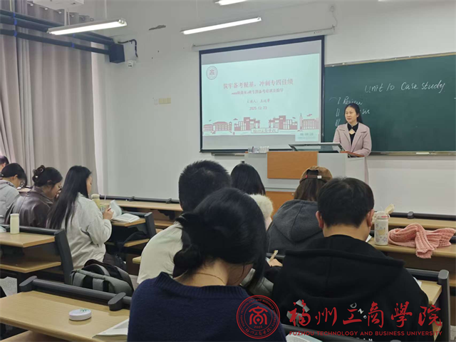 基于近一年的授课情况及前期英语专四摸底情况,王老师深入分析了当前学生中存在的基础差异显著、应试技巧不足及自主学习意识有待加强等问题。随后,王老师系统剖析了专四考试的题型及分值,并分享了针对性的答题策略与时间管理技巧,帮助同学们清晰定位自身在知识掌握与应试能力上的优势与短板,为后续查漏补缺提供了明确依据。