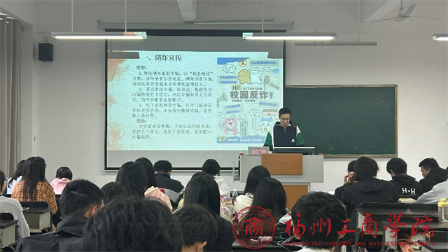 在防范网络诈骗方面,各班级聚焦大学生群体高发的诈骗类型,深入剖析了诈骗分子的作案手段和心理特征。通过讲解“冒充客服退款”“虚假兼职刷单”“冒充老师收费”等典型骗局,帮助同学们认清常见骗局的手法与特征,增强对诈骗套路的识别能力。同时,引导大家深入学习“三不”原则——不轻信、不转账、不泄露,提醒同学们妥善保护个人身份信息、银行账户和校园卡资料,不随意点击不明链接,不加入非官方群组,全面提升同学们的网络素养和反诈能力。