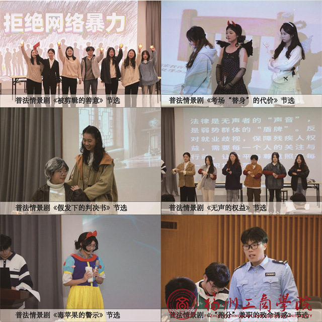 学生们围绕网络诈骗、知识产权保护、劳动合同纠纷等法律场景,组建创作团队,深挖案例素材,将枯燥的法律条文转化为生动鲜活的舞台剧情。通过 “以演释法、以景学法”的方式,有效提升了法治教育的针对性和实效性。