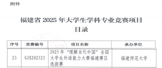 2025年“理解当代中国”全国大学生外语能力大赛福建赛区选拔赛为公益竞赛,选手无需缴交报名费,该赛事入选2025年省级大学生学科专业竞赛项目。福建省赛组委会牵头单位包括福建省教育厅、福建省外国语文学会、福建省大学外语教学研究会。